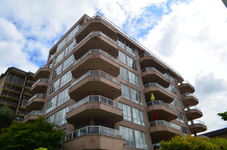 It was time for this seven-storey concrete apartment building in North Vancouver (Lonsdale) to be repainted and an engineer was consulted to provide the scope of work. Then, the owners chose a lighter, brighter, & modern colour scheme which looks fantastic. The swing stage access also provided the opportunity to undertake necessary concrete repairs, stucco repairs, and sealant renewal in various areas. The deck tiles on the exposed penthouses were removed for installation of a waterproofing membrane system and a unique paver system. With the project complete, the owners can enjoy their beautiful building and spectacular views.